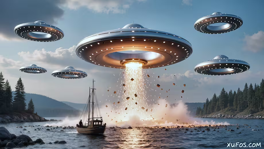 - June 21, 1947, around 2:00 p.m. Harold Dahl is out on his boat North Queen with his son Charles, two crewmen, and the family dog Sparky. They’re salvaging logs in the east bay of Maury Island. Suddenly six enormous doughnut-shaped things appear in the sky, metallic, with portholes maybe, about 100 feet across. One of them starts to wobble, drops down low over the boat, and begins spewing hot slag and molten metal. The stuff rains down, burns Charles’s arm badly enough that he needs a hospital later, kills the dog Sparky in a pretty awful way, and damages the boat. Dahl beaches it and they all hide under some cliffs until the objects finally speed off.