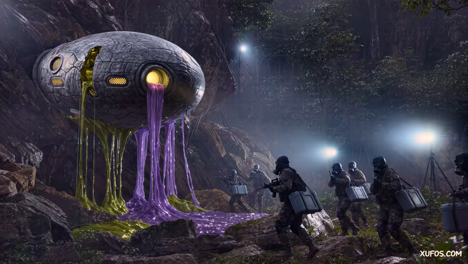 The craft had an organic quality: strange purple-green viscous liquid dripping everywhere, no machined parts, vents that absorbed light instead of reflecting it, and an almost living presence. Soon after, an unmarked team in black camouflage (no insignia) and full MOPP gear (gas masks, rubber suits) arrived aggressively, took control, shackled Weygandt, interrogated him, threatened him with severe consequences if he ever spoke, and removed him from the site.